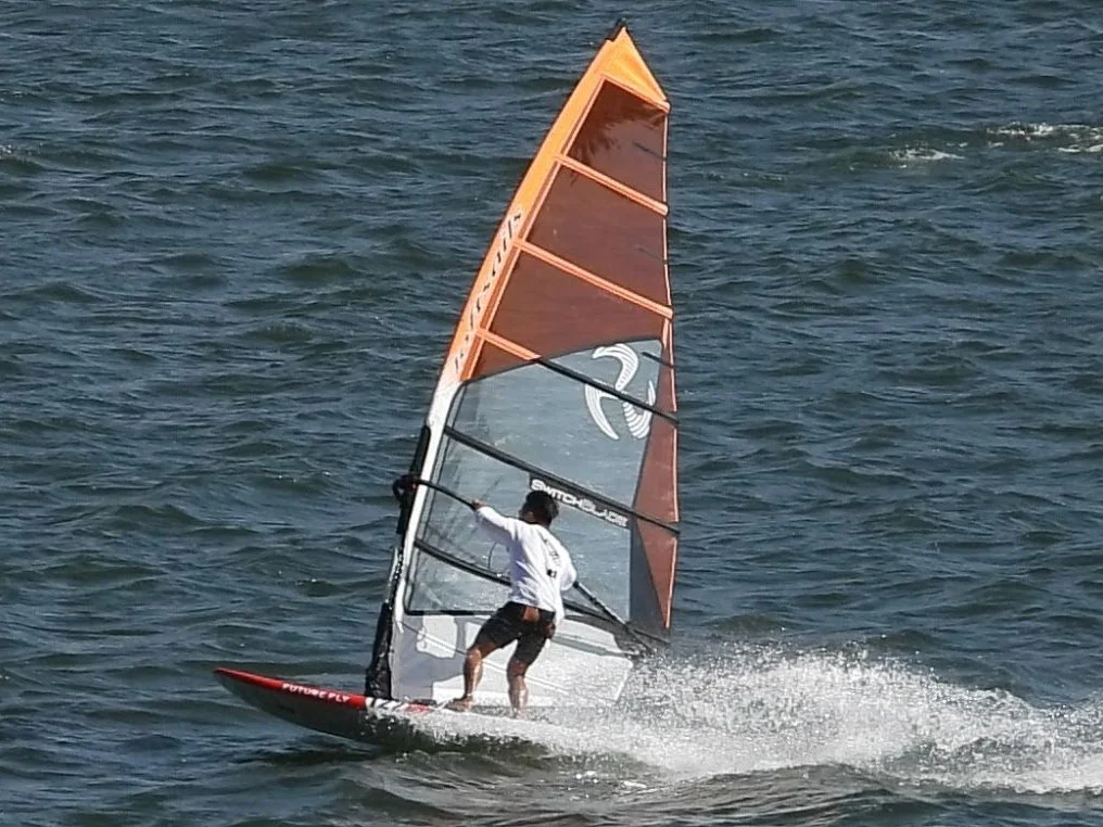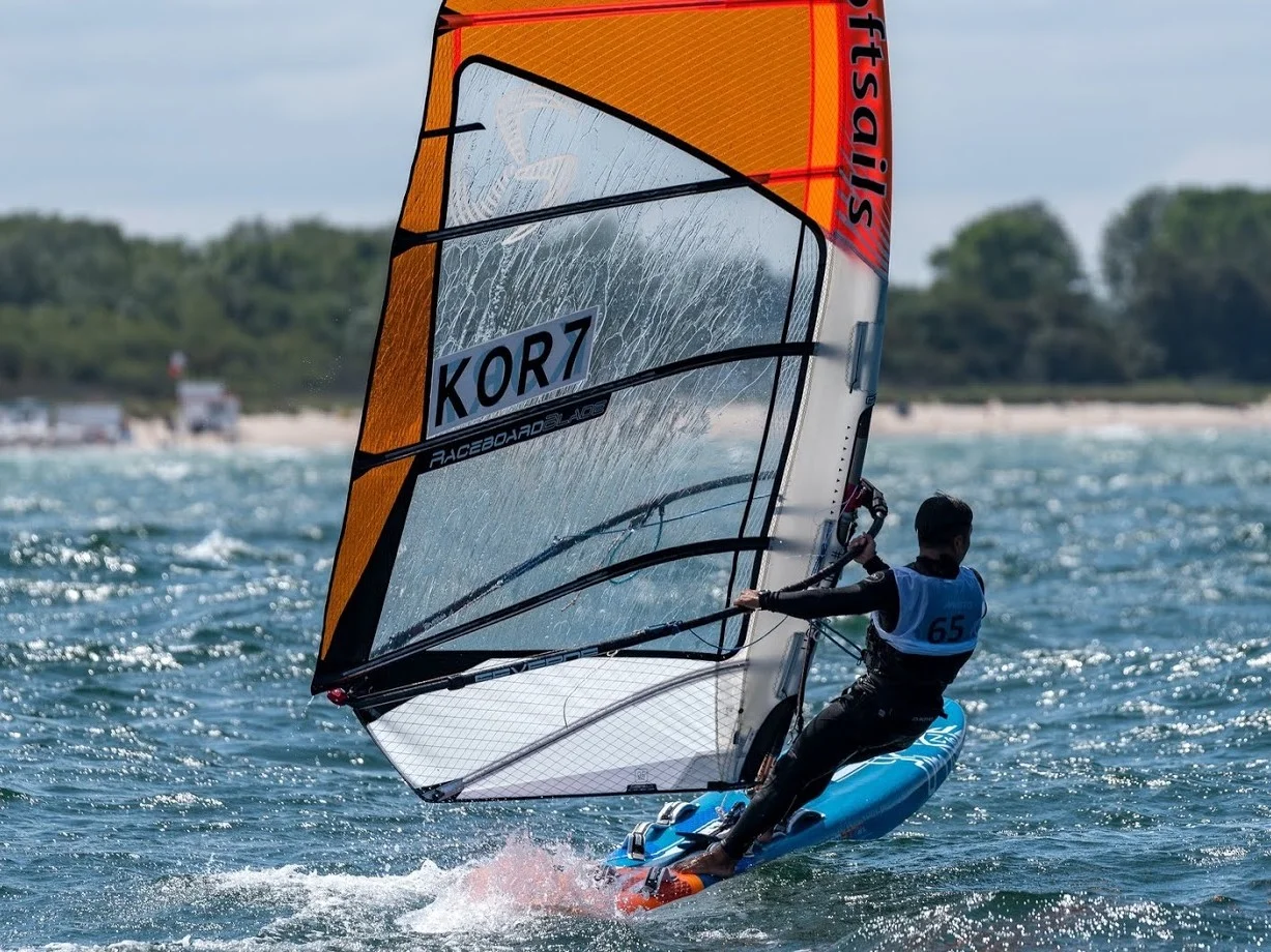 For light wind, we need a soft and light sail that pumps well. But when the wind does come up, it needs some stiffness too. The best allround sail to meet these requirements is the Loftsails Raceboard LW.