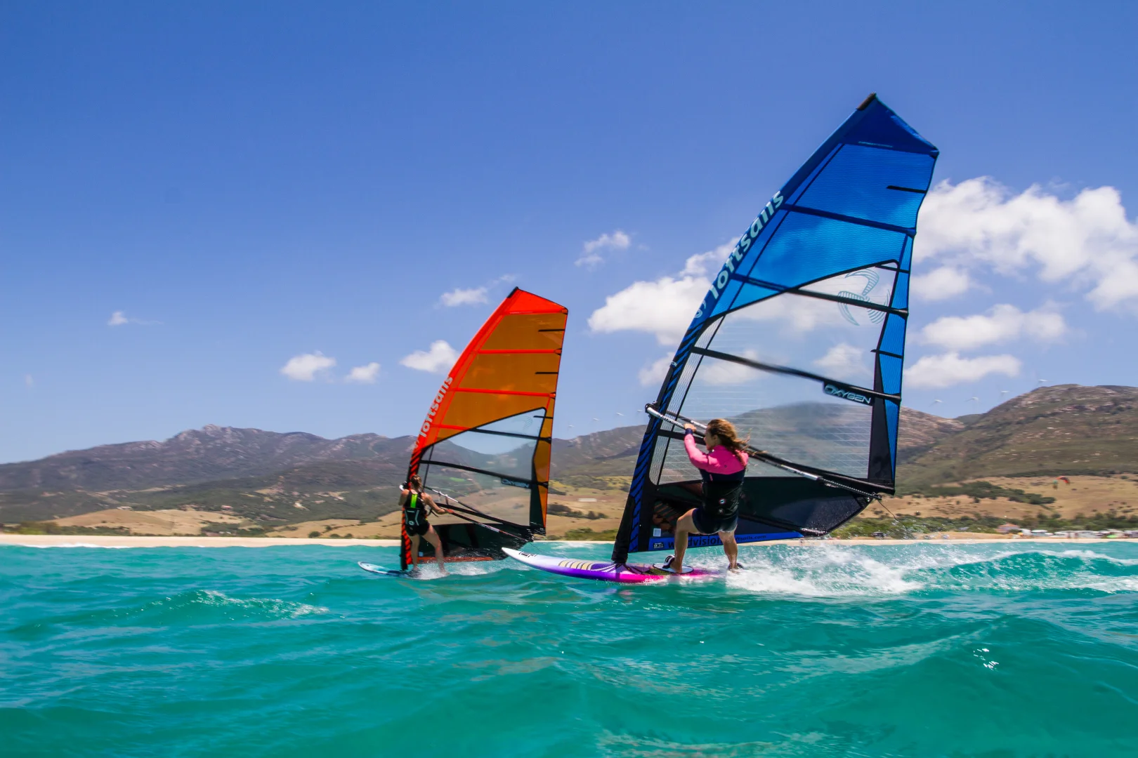 No difference on the water. Both the orange (bi-ply 4mil monofilm) and the blue (3.5mil biax xply) materials are more stretch-resistant compared to the 2mil (triax) that some brands use for flatwater sails. The performance advantage of 3.5 and 4mil materials over 2mil xply was well established in tests the summer of 2015.