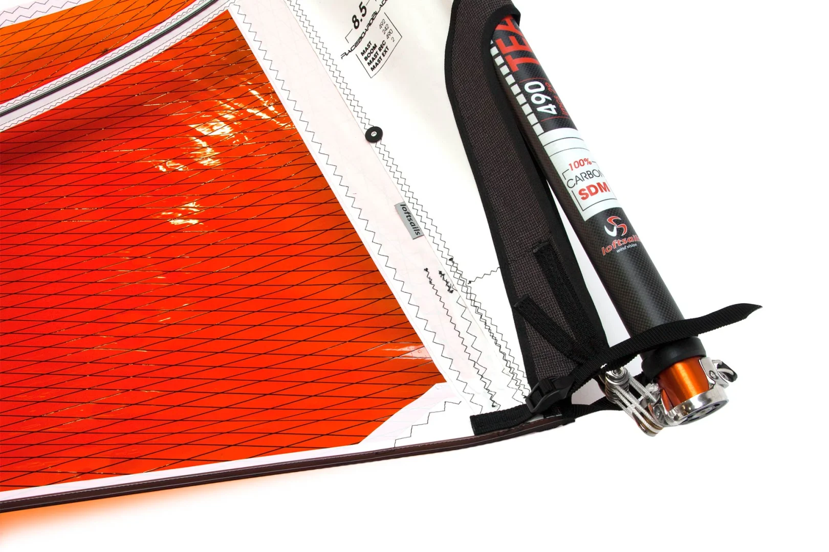 - Blade mast-pocket construction features mast panel and mast-pocket sides (3 layers) that are tensioned directly (all 3 layers under tack pulley webbings)– therefore downhaul tension is equalized between the mast panel and the mast pocket resulting in the Raceboard Blade’s firm, clean, easy-rotating leading edge